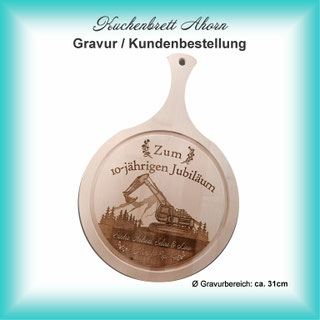 - grosses Kuchenbrett aus Ahorn, graviert zum 10-jährigen Bestehen einer Baggerfirma; Unikat; 150.- CHF exkl. Material